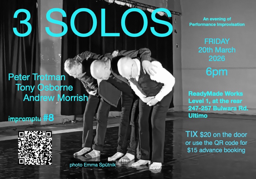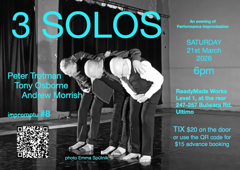 I am a multi-discipline improviser — a Sydney-based theatre, voice, dance and sound artist. I have created numerous solos since 1991 many of which were improvised. I have performed in all capital cities in Australia, in the UK, USA, Germany, China & Switzerland. I am a long-standing member of the Splinter Orchestra and was a bass singer in Sydney University Graduate Choir for ten years until 2020. I have led improvisation workshops in most states of Australia and this work is ongoing in Sydney. For more info about coaching & small group facilitation, get in touch (see contact page for details).