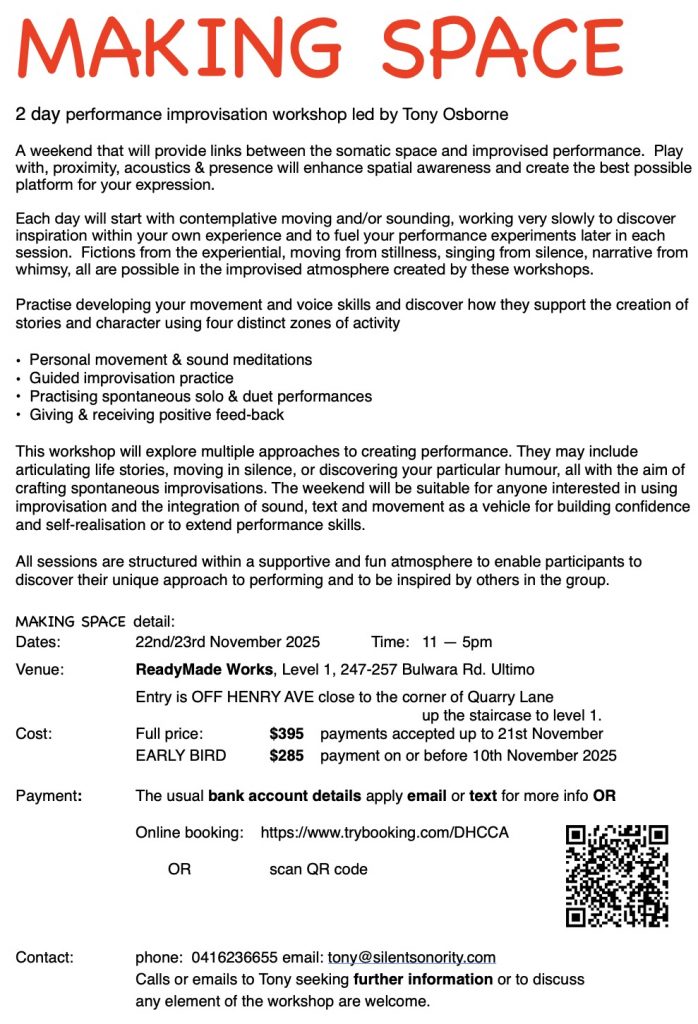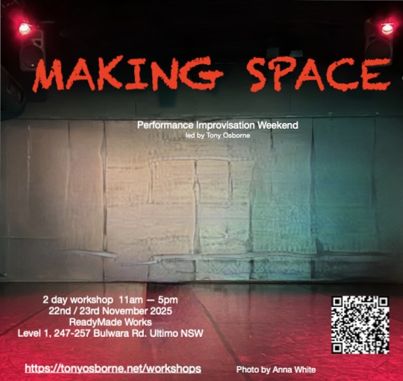 2025 is the 24th year of leading workshops in Sydney and I am still fascinated and challenged by the process. In 2022 I made Readymade Studios in Ultimo my new base for workshops and practice. Over the last 24 years I have helped hundreds of people to build their confidence to speak or move and to do so in a variety of settings. Many artists from different disciplines have also attended the workshops over the years to either add performance to their existing skills or to refresh or find their particular style or mode of performing.