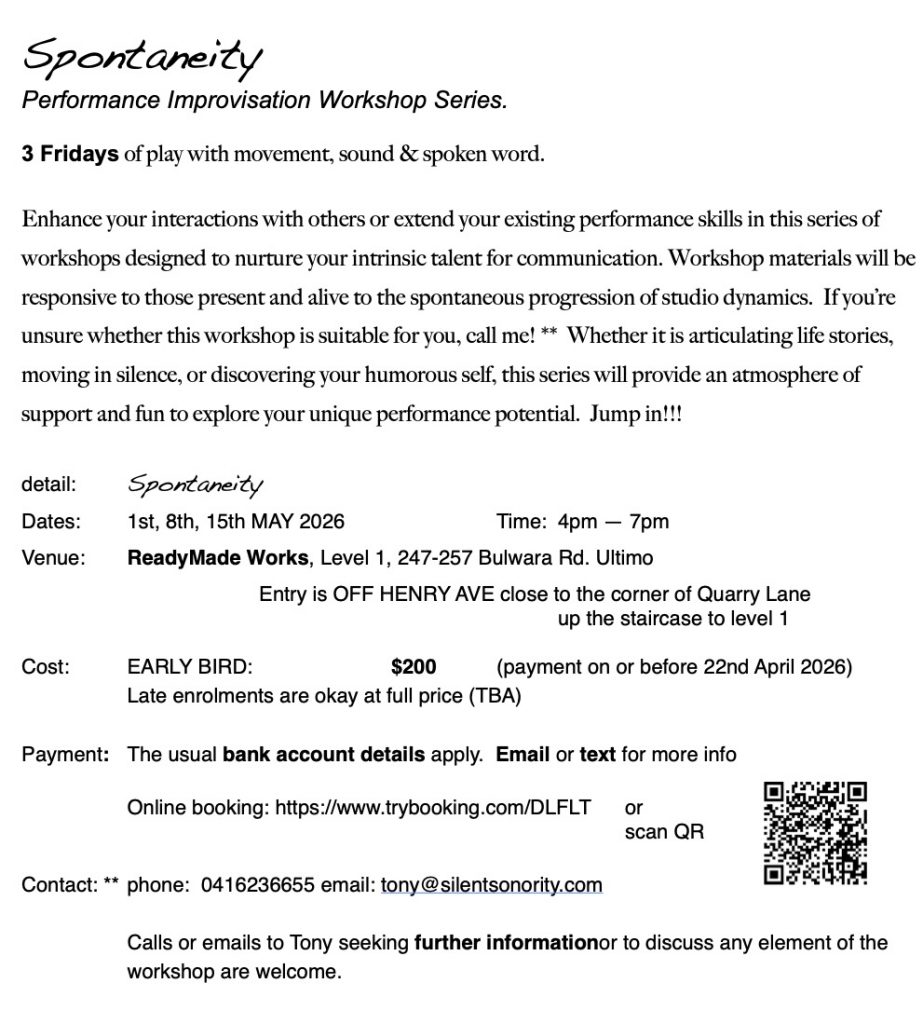 2026 is the 25th year of leading workshops in Sydney and I am still fascinated and challenged by the process. In 2022 I made Readymade Studios in Ultimo my new base for workshops and practice. Over the last 25 years I have helped hundreds of people to build their confidence to speak or move and to do so in a variety of settings. Many artists from different disciplines have also attended the workshops over the years to either add performance to their existing skills or to refresh or find their particular style or mode of performing.